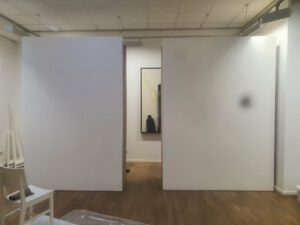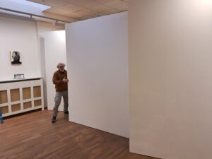 Galerist Esad Puzić, zusammen mit Bildhauer Michael Ott (der seine Skulptur-Objekte bereits in diesen Jahr hier ausstellte), arbeitete nun in der vergangenen Woche am Aufbau von drei beweglichen Modulen, die sowohl als Ausstellungswände gebraucht werden können, also auch als Raumteiler und Lagerregale nötig geworden sind, denn die Galerie hat nun bereits eine wachsende Anzahl vor Werken der ausgestellten Künstler, die weiterhin den Besuchern zum Verkauf oder zur Betrachtung gezeigt werden können.