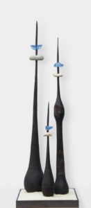 In derselben Ausstellung zeigen wir die eigenwilligen, formvollendeten Holz-Skulpturen des Saarbrücker Bildhauers Michael Ott – seine fein-elaborierten Gefässe und Giacometti-haften Stelen wirken gleichzeitig stark und zerbrechlich, im Sinne einer der Natur abgelauschten Sensibilität der faserhaften Leuchtkraft des lebendigen Holzes, die der “Woodturner” und Künstler aus den Bäumen, seinem Material, gedrechselt und gewonnen, dann oft auch geflammt oder mit Stein und Glass verbunden hat. In der Werkgruppe Hinter der Litfaßsäule, zum Beispiel, steht die Behandlung mit dem Feuer für den Klimawandel, und die Anordnung der Skulptur für die Menschen auf der Klimaflucht.